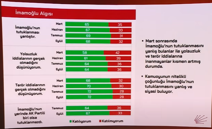 Buna göre, seçmenin büyük çoğunluğu İmamoğlu’na yönelik ‘iddiaları’ reddederken “tutuklanması yanlıştır” diyenlerin oranı yüzde 64’e yükseldi.