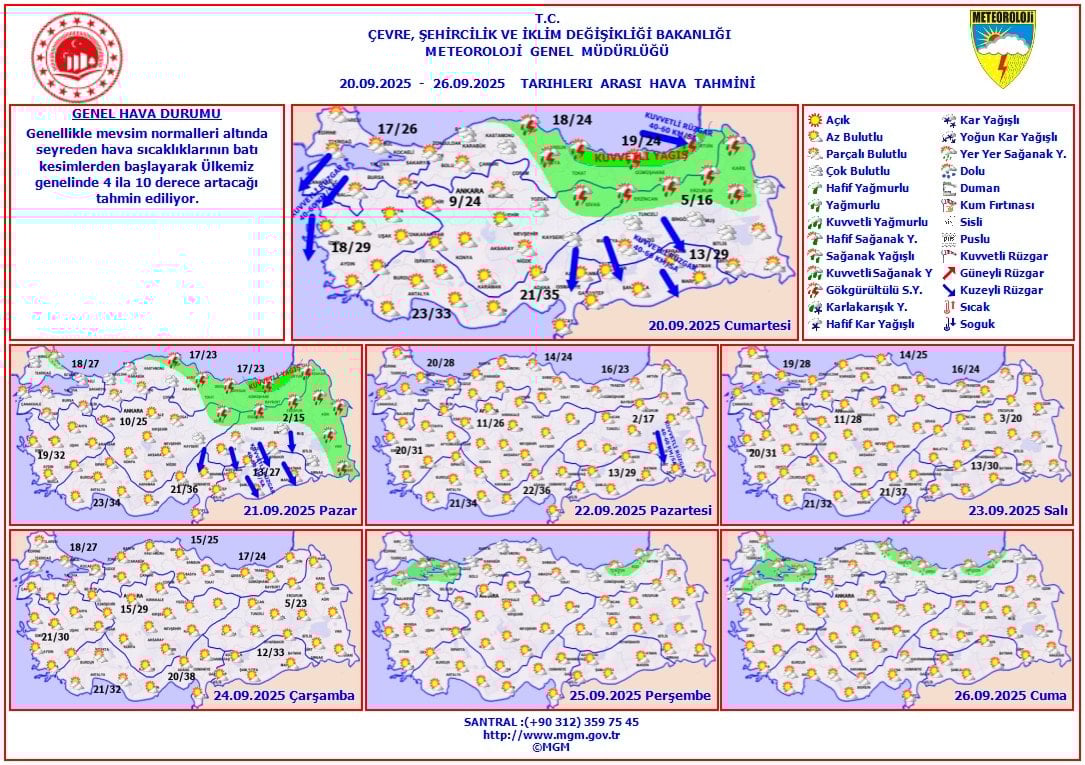 Genellikle mevsim normalleri altında seyreden hava sıcaklıklarının batı kesimlerden başlayarak ülkemiz genelinde 4 ila 10 derece artacağı tahmin ediliyor. pic.twitter.com/9cS3dOBaNn— Meteoroloji (MGM) (@meteoroloji_twi) September 19, 2025